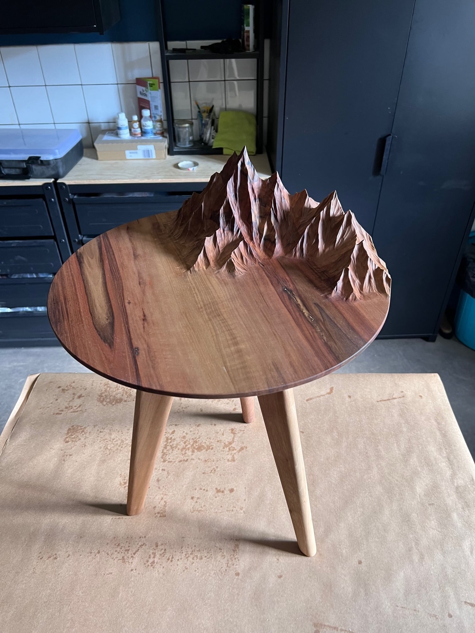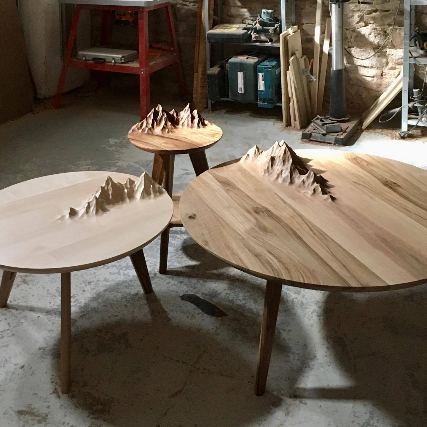 #手作りの温もり - Ben&Manu職人がフランスで心を込めて作成した山脈テーブルです。自然の美しいクルミ材を使用しており、一つ一つ異なる木目が魅力的。あなたのお家にぴったりの一品がここにあります。